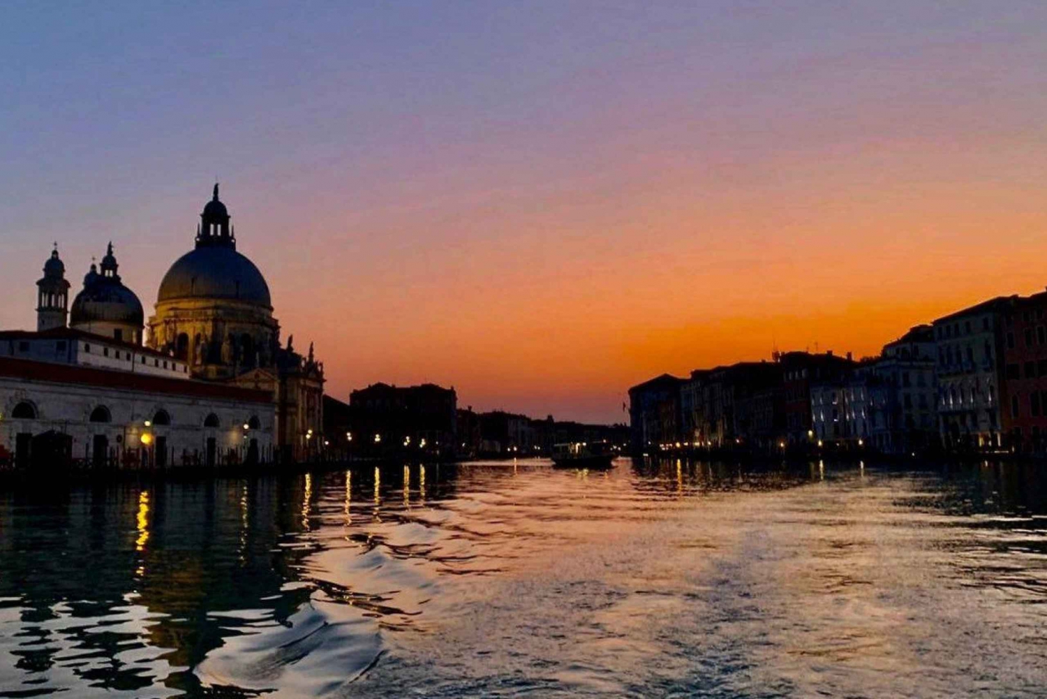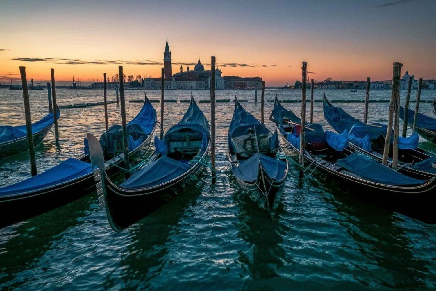 شق طريقك إلى نقطة الالتقاء في وسط مدينة البندقية قبل المتابعة إلى نقطة الصعود والانطلاق في رحلة بحرية لمشاهدة غروب الشمس ذات المناظر الخلابة. أثناء ركوبك في أحد الجندول الشهير في المدينة، استمتع بانعكاسات الهندسة المعمارية التاريخية على مياه القناة الكبرى. استمتع بالأجواء الرومانسية والساحرة التي يخلقها الضوء وأنت تجلس وتسترخي. قم بزيارة الزوايا المخفية للمدينة الشاطئية عن طريق عبور القنوات الصغيرة للاستمتاع بتجربة أكثر هدوءًا وأكثر حميمية. تأكد من التقاط بعض الصور الرائعة على طول الطريق قبل العودة إلى نقطة المغادرة الأصلية.Includes