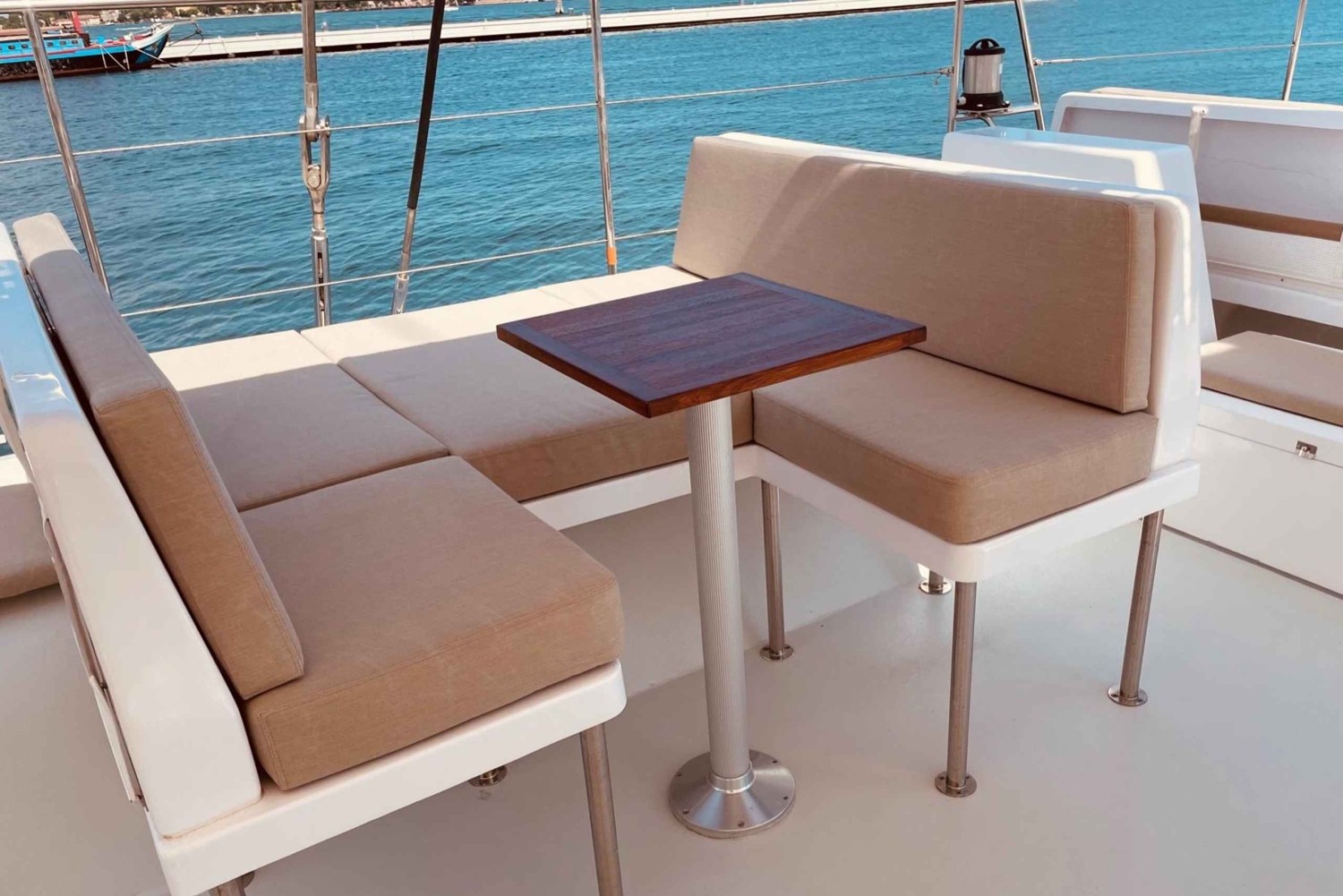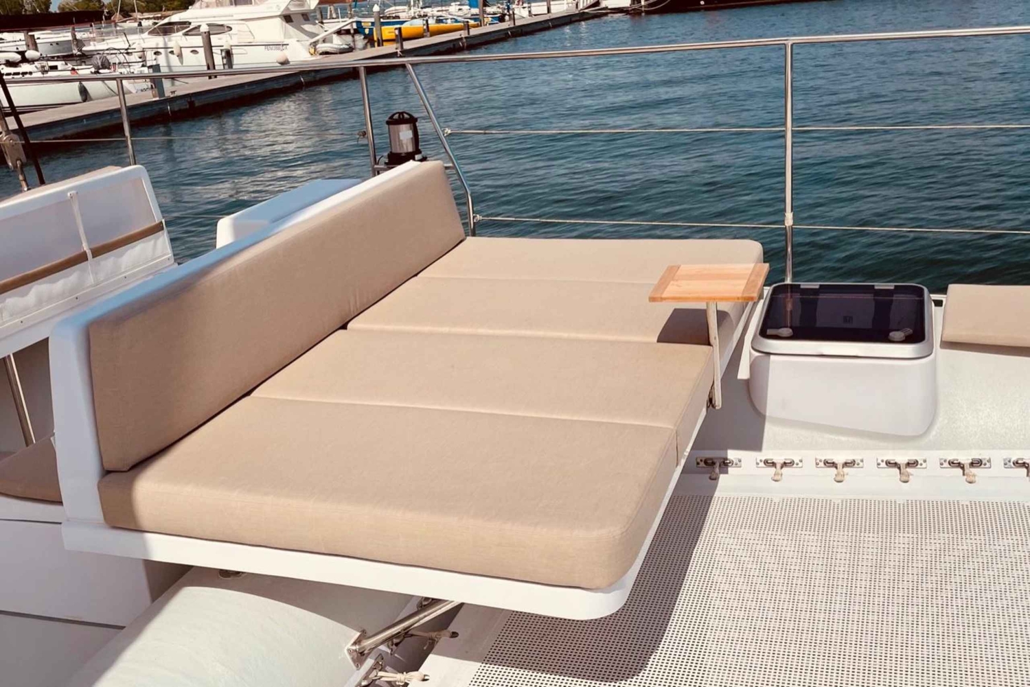 - Elegante catamarán con cómodos asientos y amplio espacio para pasear