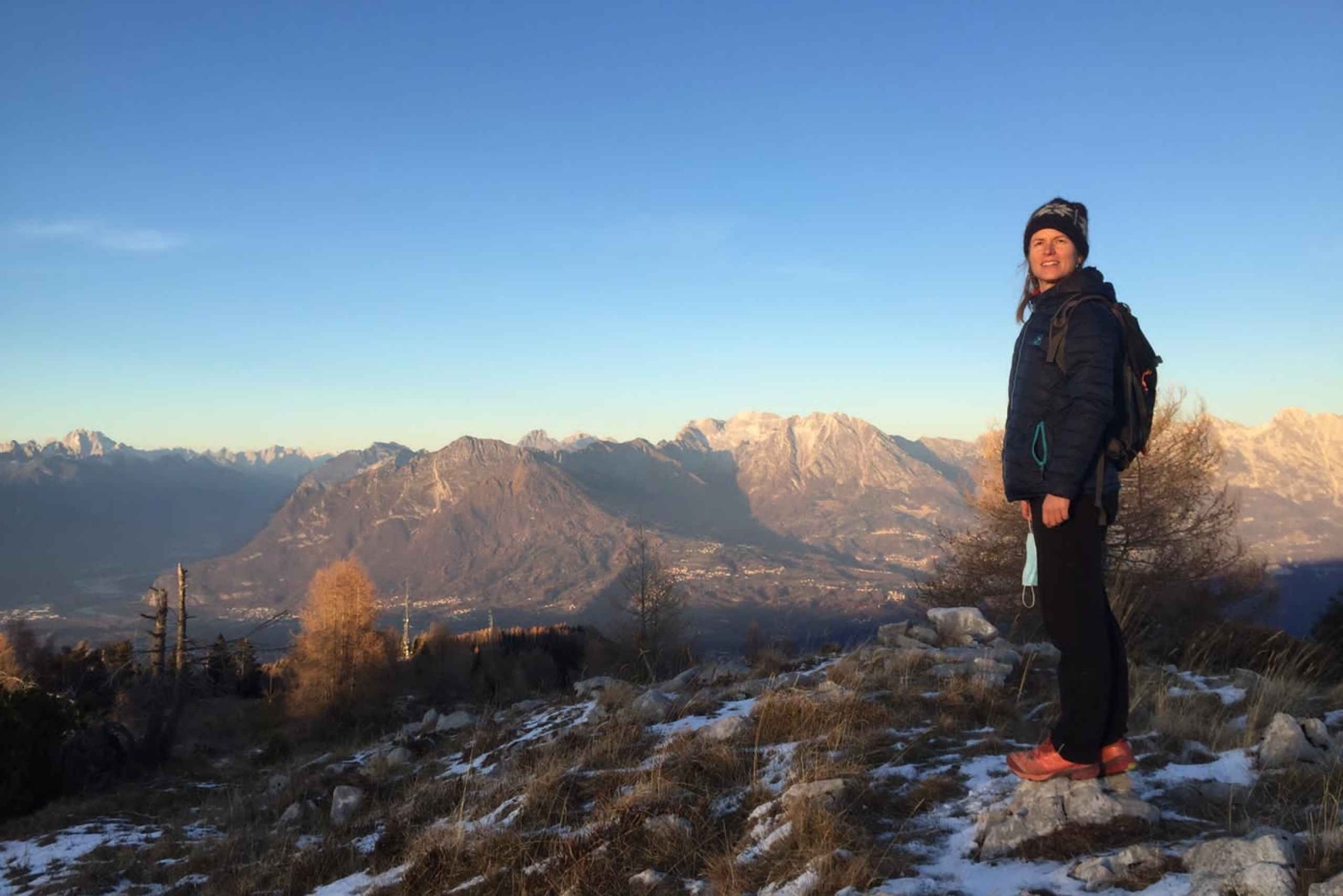 Sunset and night winter hike between Dolomites and Venice