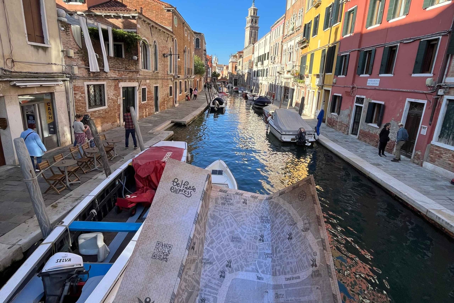 A game to play with friends, a new concept of sightseeing, a cultural and interactive walk: Belpaese Express is all this and much, much more. Designed for all ages, all you need is a smartphone and an internet connection to travel through time and dive into an extraordinary open-air adventure, where smartness and fun come together in order to discover Italy's most beautiful art cities and villages. THE EXPERIENCE IS SELF-GUIDED, WITHOUT THE PRESENCE OF GUIDES OR SUPERVISORS. A shady character has appeared in Venice: he is tall, dressed in black and wearing a strange big hat. He prowls the “calli” at night, frightening the ladies and harassing passers-by, causing panic among the population. This is why the Serenissima is looking for someone who will be able to capture him… The mission, available in Italian and English, can be played every day except Tuesday from 8.30 am to 9pm. How does it work? Once you have chosen the mission and purchased the experience, you will recive an access link by email, click on it and an interactive chat will appear.The chat will guide you through the adventures in your destination What do you need to play? No application required: you only need a charged phone with an internet connection. All props and maps will be provided you at the beginning of the experience. What do you need to know before starting? Follow the instructions written in the mission's recap section, like the timetable, lenght of the experience, starting place and so on. Recap Where: Venice Itinerary lenght: approx. 5 km Lenght of the experience: Approx. 3 hours Time limit: None Starting location: Calle Bergami 917 S.CroceIncludes