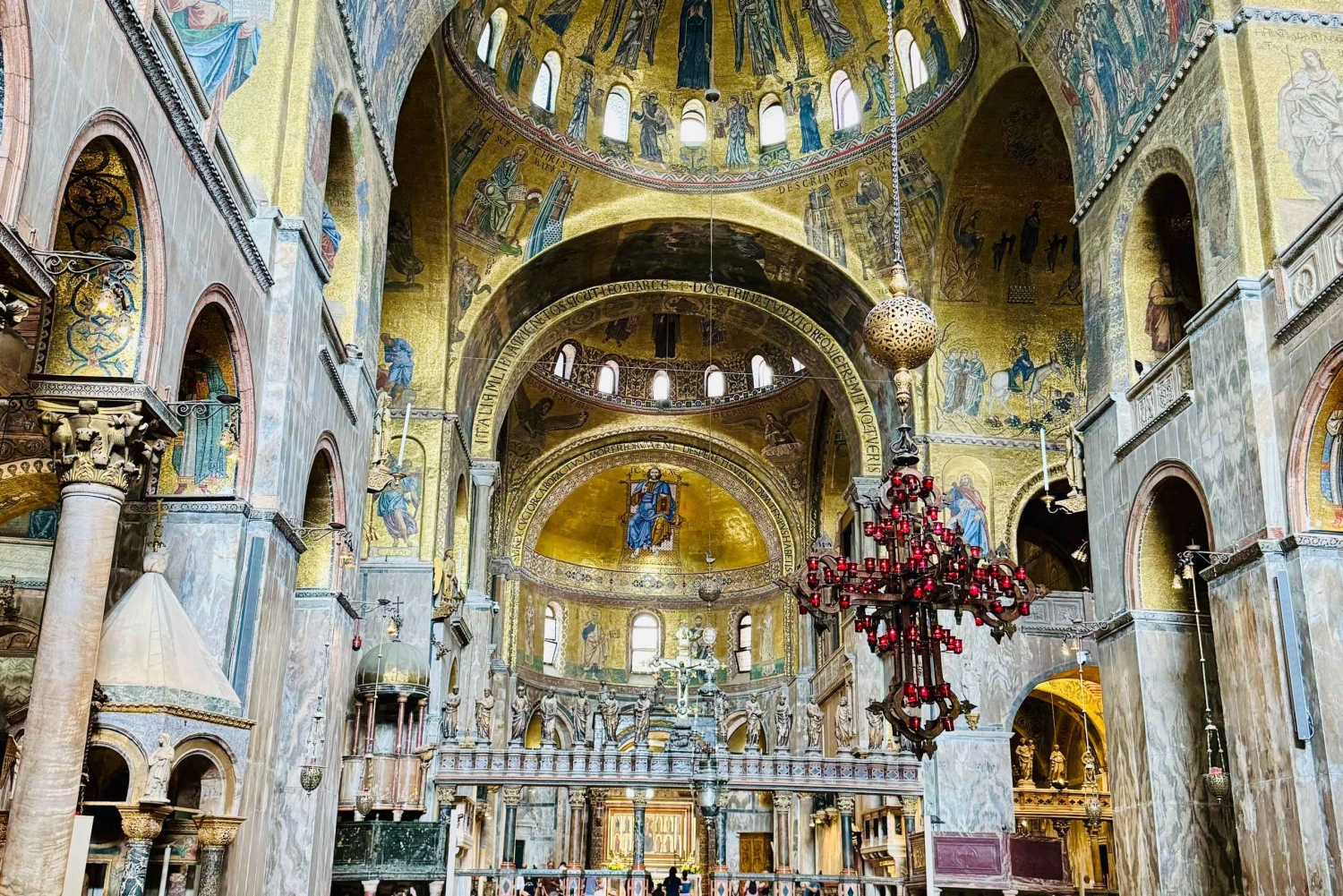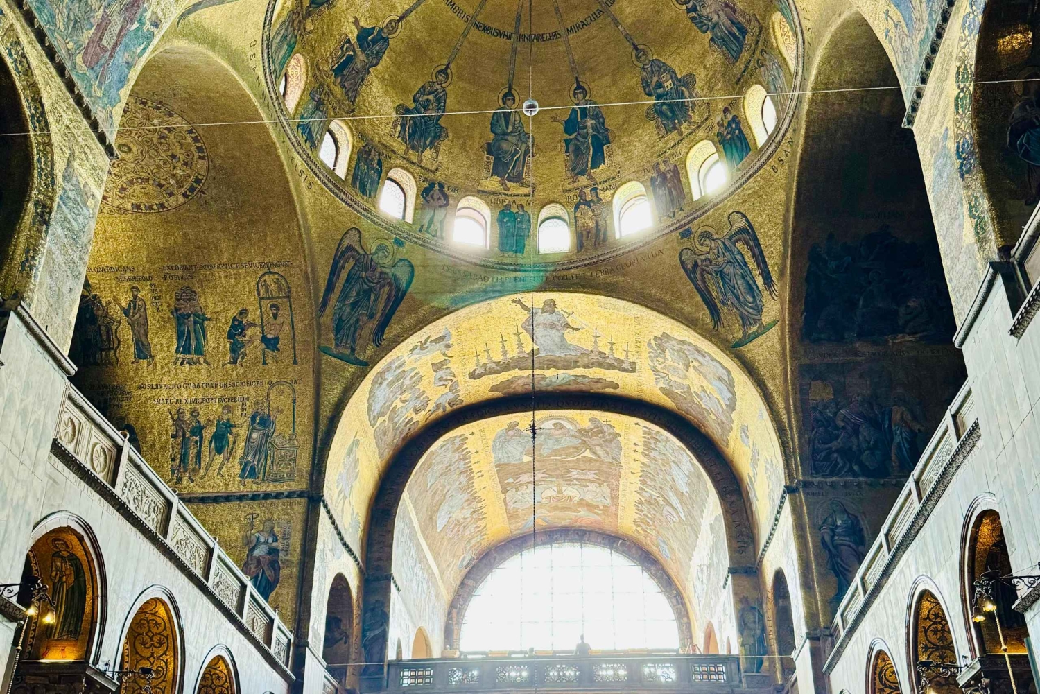 Lähde paikallisen oppaan johdolla kiertoajelulle Pyhän Markuksen basilikaan, jota pidetään yhtenä Venetsian tärkeimmistä rakennuksista. Tutustu todelliseen bysanttilaisen taiteen mestariteokseen, joka oli aikoinaan dogen yksityiskappeli. Kuuntele ulkoapäin alkaen julkisivun mosaiikeissa esitettyjä Uuden ja Vanhan testamentin tarinoita ja tutustu kirkon arkkitehtonisiin elementteihin. Ihaile upeaa sekoitusta bysanttilaista, goottilaista ja renessanssiarkkitehtuuria, joka kuvastaa Venetsian kulttuuriperintöä kaupan ja kaupankäynnin keskuksena. Astu jonon ohituslipun avulla sisään basilikaan tuhlaamatta aikaa pitkiin jonoihin ja ihastu katon 8000 neliömetrin kokoisten kultaisten mosaiikkien näkymään.Includes