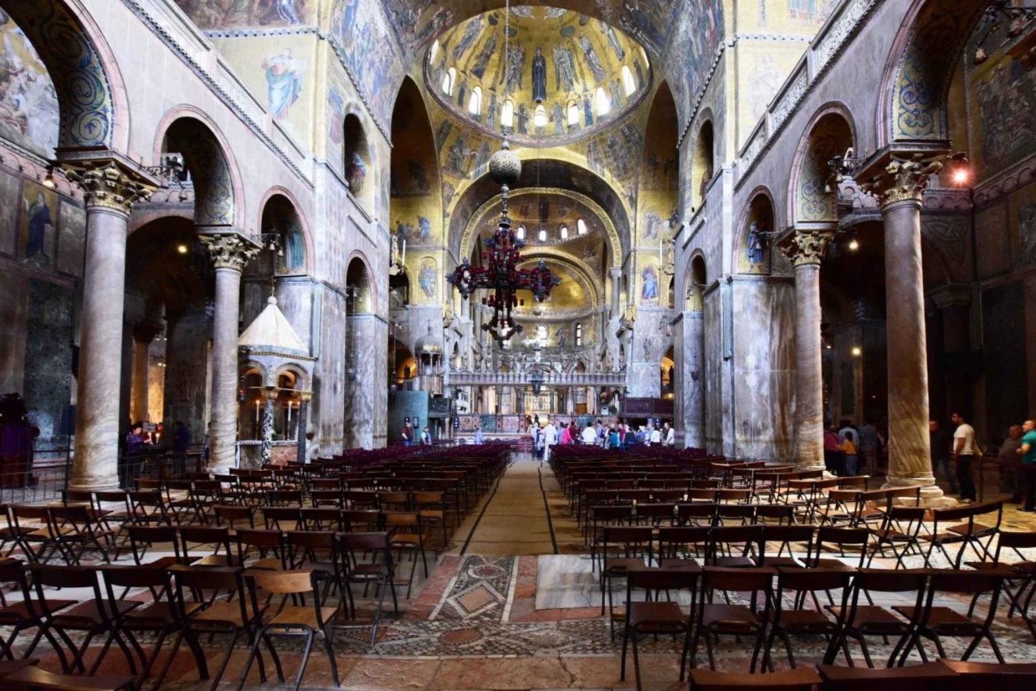 Se høydepunktene i Markuskirken med en lokal guide. Lær om historien, beundre de gylne mosaikkene og oppdag skattene som er skjult i en av Venezias viktigste kirker. Møt guiden din nær den berømte Piazza San Marco og dra direkte til Markusbasilikaen. Når du går inn i atriet, kan du se opp og beundre de glitrende mosaikkene som introduserer deg for den rike symbolikken i dette hellige rommet. Innvendig følger du guiden gjennom kirkens hovedområder og hører historier om konstruksjonen, formålet og transformasjonen gjennom århundrene. Oppdag fantastiske detaljer som de gylne kuplene, ikonostasisen, marmorinnleggene og alteret som huser relikviene til St. Markus evangelisten. Dette guidede besøket gir deg en dypere forståelse av basilikaens kunst og arkitektur, samt dens rolle i Venezias religiøse og politiske liv.Includes