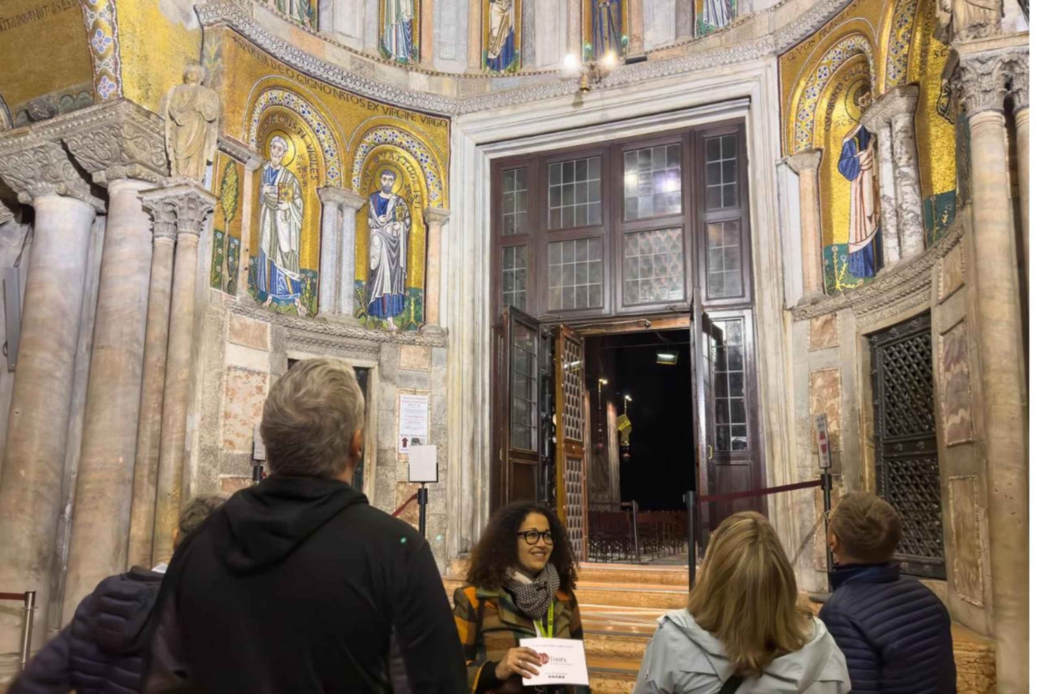 Poznaj Wenecję po zmroku podczas prywatnego wieczornego spaceru po jej urokliwych uliczkach. Ciesz się ekskluzywnym dostępem VIP do Bazyliki Świętego Marka, podziwiając jej złote mozaiki i spokojne piękno.