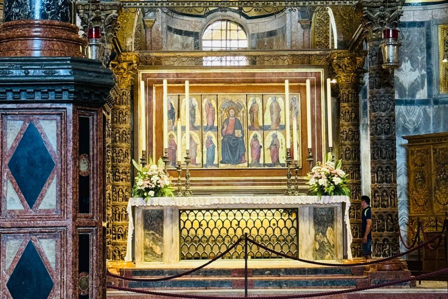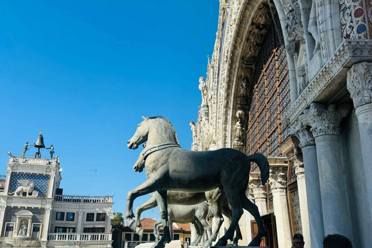 Bem-vindo a Veneza, onde cada canto esconde uma história e cada edifÃcio carrega séculos de história! Com o nosso novo tour 'Veneza vista de cima e de dentro', terás a oportunidade de explorar dois dos marcos mais emblemáticos da cidade: A BasÃlica de São Marcos e o Campanário de São Marcos. Graças ao nosso guia de áudio transferÃvel, podes desfrutar de uma experiência imersiva e autoguiada diretamente a partir do teu telefone, com ideias cativantes, lendas e detalhes arquitectónicos que tornam este património verdadeiramente único. O que está incluÃdo na excursão: - Entrada sem fila na BasÃlica de São Marcos Evita as longas filas e mergulha imediatamente na beleza da BasÃlica. O teu ingresso inclui o acesso ao terraço panorâmico, que oferece uma vista deslumbrante sobre a Praça de São Marcos e a lagoa veneziana - um ponto de vista exclusivo para ver Veneza de cima! - Museu de São Marcos Este ingresso também dá acesso ao Museu de São Marcos, onde podes explorar tesouros artÃsticos e históricos que contam a história milenar de Veneza, incluindo os famosos cavalos de bronze que outrora adornavam a fachada da BasÃlica. Descobre a história fascinante destas obras e a sua viagem aventureira através de mares e continentes. - Entrada sem fila no campanário de São Marcos Sobe à torre icónica da cidade para uma vista deslumbrante de 360 graus sobre Veneza e as ilhas circundantes. O guia de áudio revelará detalhes sobre a construção da torre, as suas restaurações e o seu significado na vida veneziana, juntamente com histórias dos famosos sinos. Guia de áudio descarregável para uma experiência autêntica e flexÃvel Com o nosso guia de áudio descarregável, podes ouvir explicações detalhadas a partir do teu smartphone, ao teu próprio ritmo. O guia foi concebido para te acompanhar em todos os pontos de interesse, com uma visão única sobre a história e as curiosidades da BasÃlica e do Campanário, enriquecido com anedotas para tornar a tua visita inesquecÃvel.Includes
